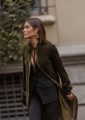- Crepe de alto gramaje con caída estructurada.