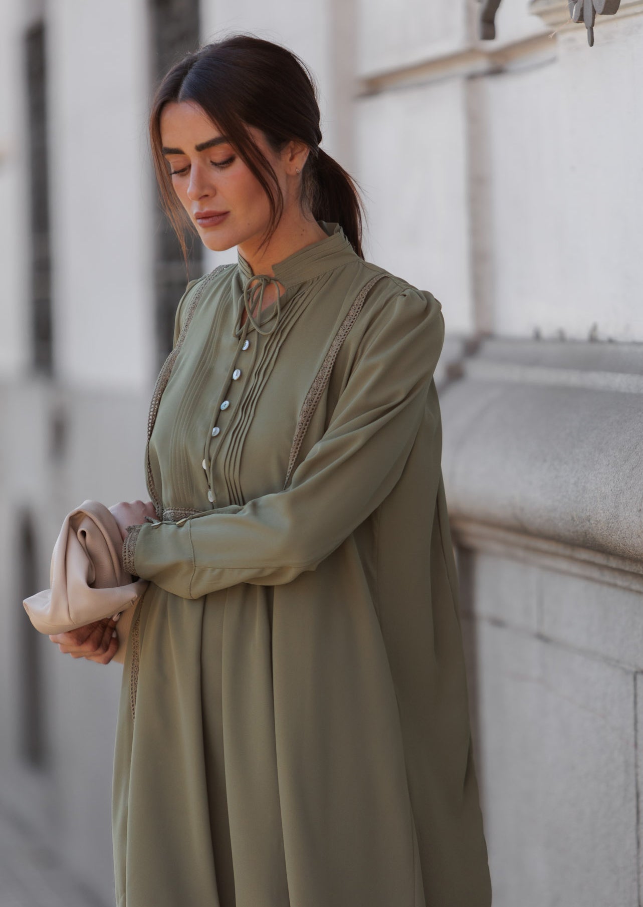 - Vestido de crepe georgette color kaki.