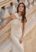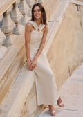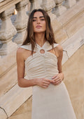 - Robe confectionnée en maille beige avec une touche de brillance.