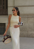 - Falda de crepe confeccionada al bies con goma invisible en cintura.