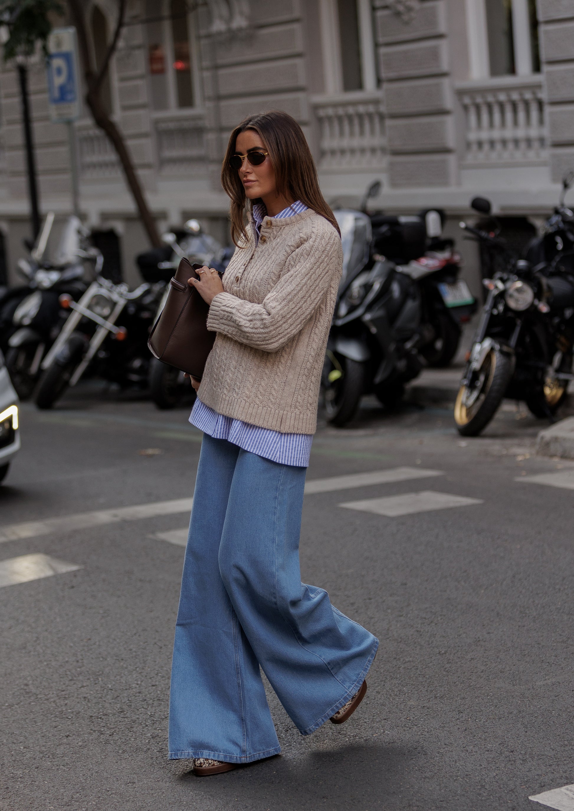 - Tejido denim con grosor medio. Con cuerpo pero sin rigidez, que permite que la campana caiga con una fluidez natural.