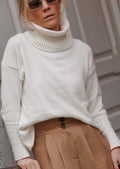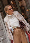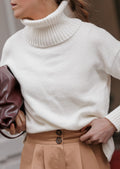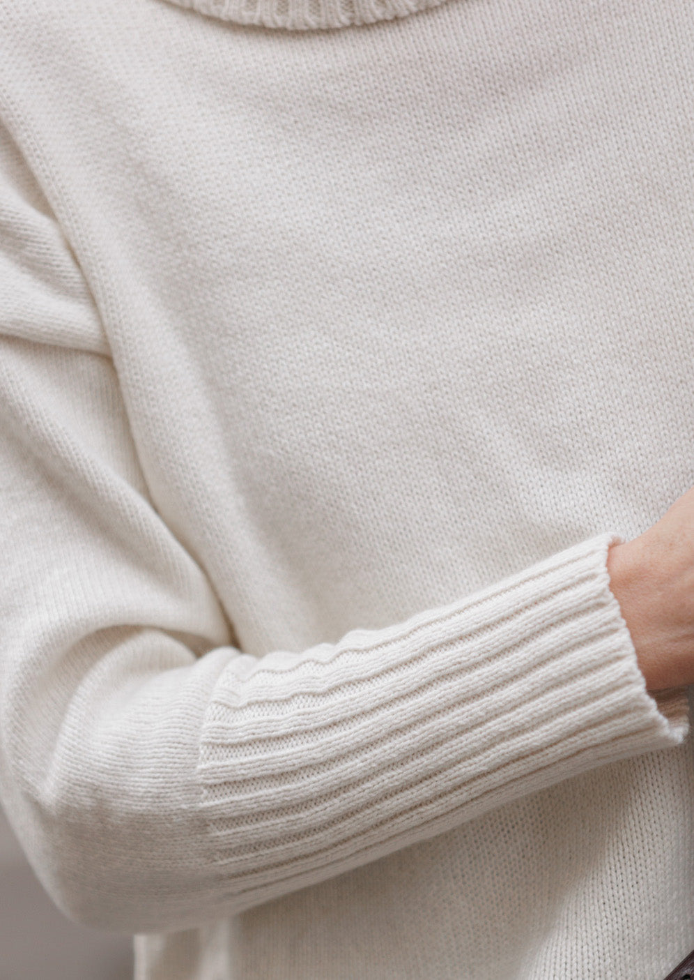 - Corte recto y patrón más corto por delante y ligeramente más largo por detrás, diseñado para llevarlo con pantalones de tiro alto y bajo chaquetas o blazers sin añadir volumen.