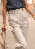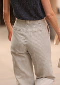 - Pantalón confeccionado en sarga tejida con fina raya color azul marino.