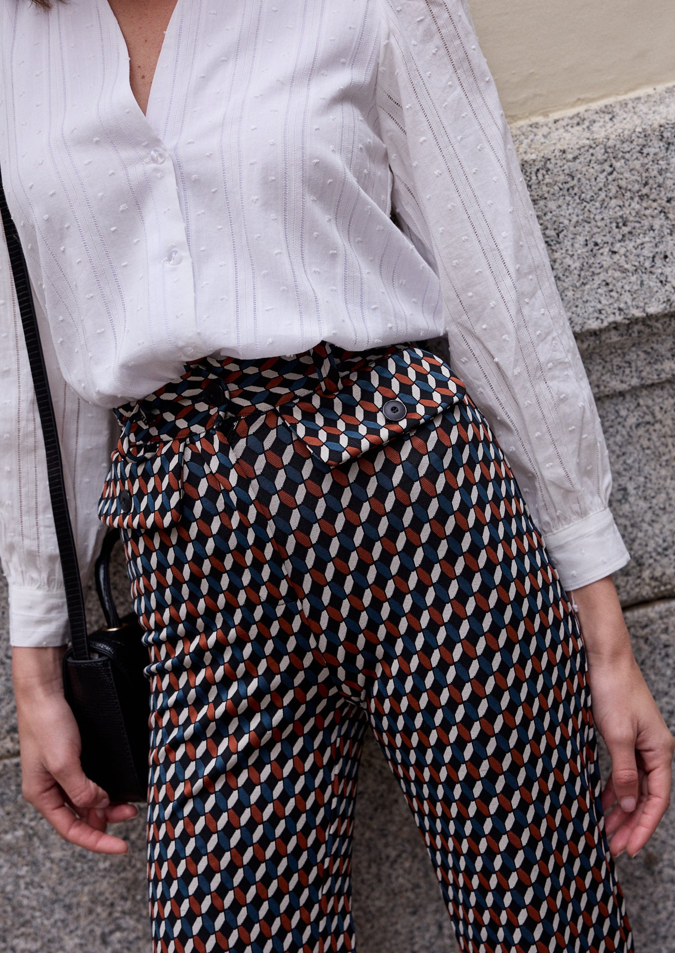- Detalle de solapa en la parte delantera con botón.