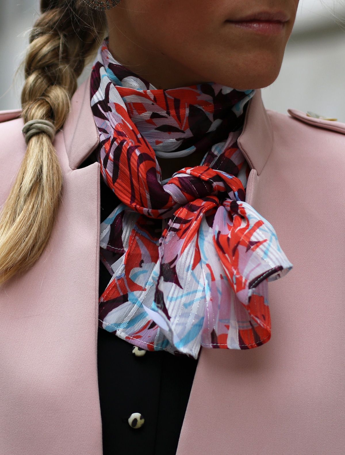 – Pañuelo estampado en tonos naranjas con notas coral, marrón, teja y azul clarito.